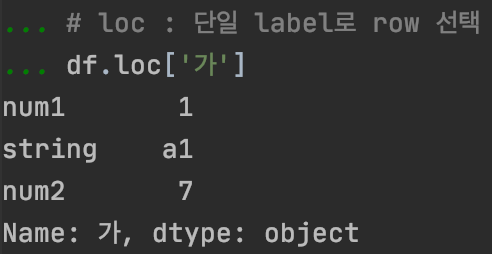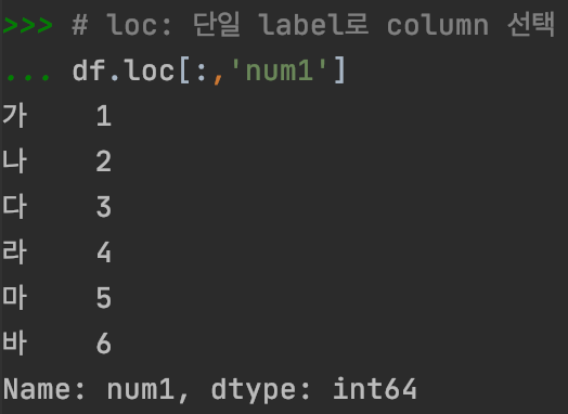 df1 = df.loc[:,['num1']] # list 형태로 불러오기 -> DataFrame