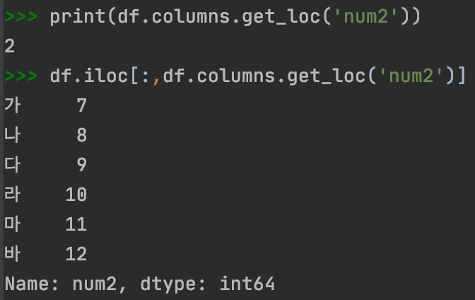 때론 위치와 값을 혼횽해야 할 때가 있다. 예를들어 (어떤 이유로) row는 index값으로, column은 위치로 subdata를 불러와야 한다면, Dataframe의 .get_loc을 활용할 수 있다. .get_loc은 해당값의 위치를 반환하기 때문에 .iloc의 입력값으로 사용할 수 있다. index와 column 둘 다 사용할 수 있으며 예시는 아래와 같다.