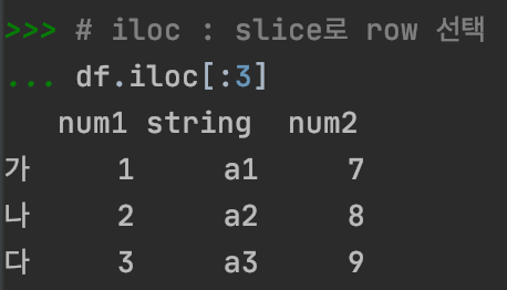 | List나 array형태의 label | d.iloc[[2,3,4]] |