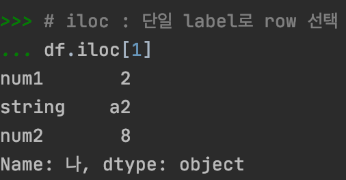 .iloc은 data의 위치를 정수 형태로 입력받는다. iloc과 마찬가지로 row와 column을 각각 선택할 수 있다.